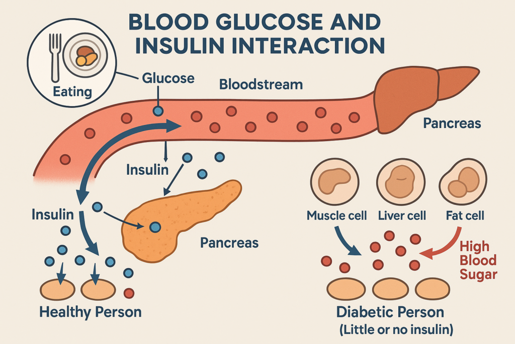 જ્યારે આપણે ખોરાક ખાઈએ છીએ, ત્યારે તેમાંથી ગ્લુકોઝ (એક પ્રકારની શુગર) બને છે, જે લોહીમાં ભળીને શરીરના કોષો સુધી પહોંચે છે. આ ગ્લુકોઝ કોષોમાં પ્રવેશીને ઊર્જા પૂરી પાડે તે માટે ઇન્સ્યુલિન નામના હોર્મોનની જરૂર પડે છે, જે સ્વાદુપિંડ (પેન્ક્રિયાસ) દ્વારા બનાવવામાં આવે છે. ડાયાબિટીસની સ્થિતિમાં: